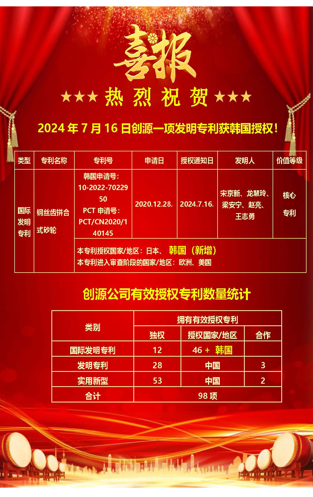 2024年7月16日创源一项发明专利获韩国授权!