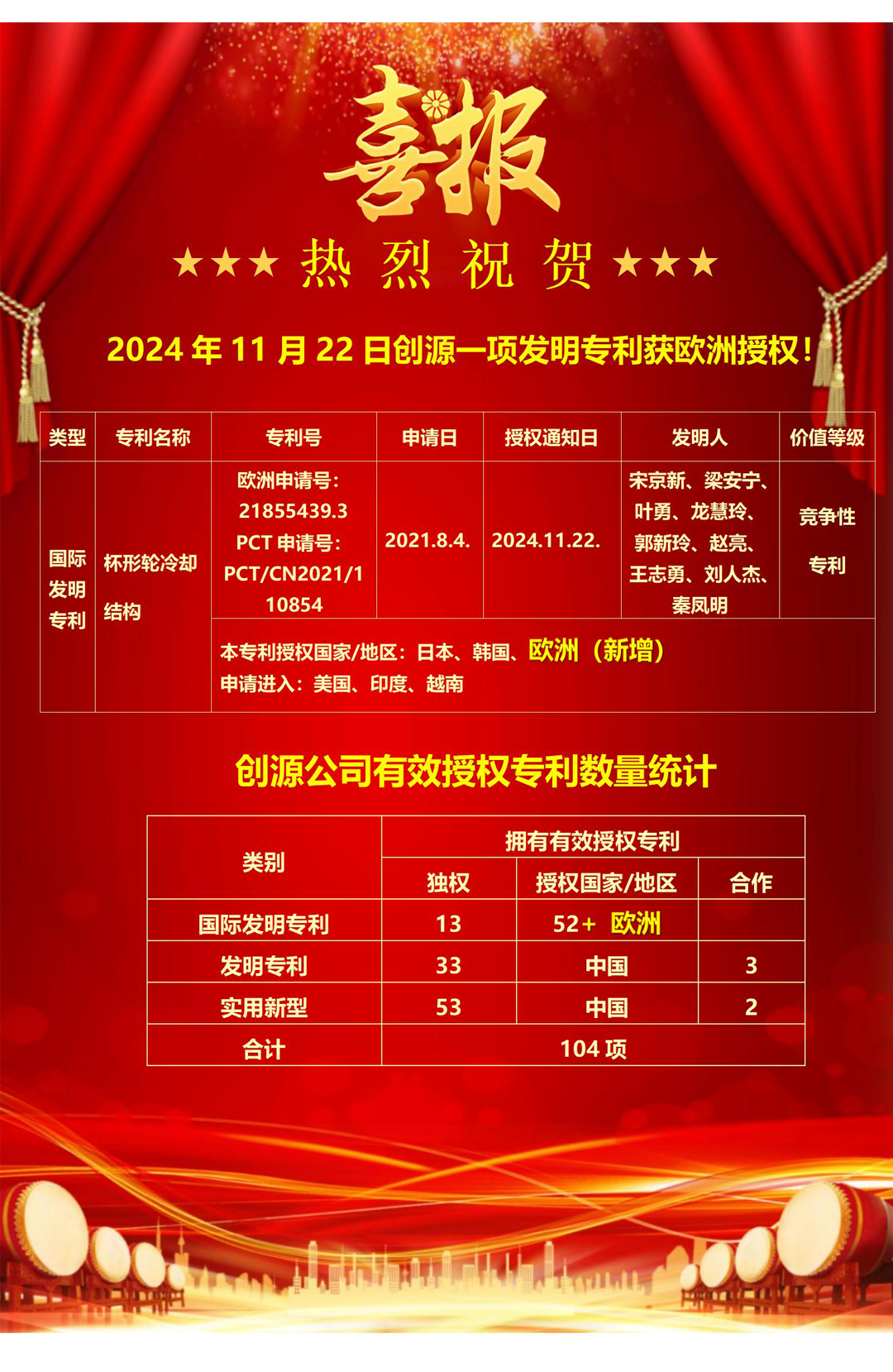 2024年11月22日创源一项发明专利获欧洲授权!